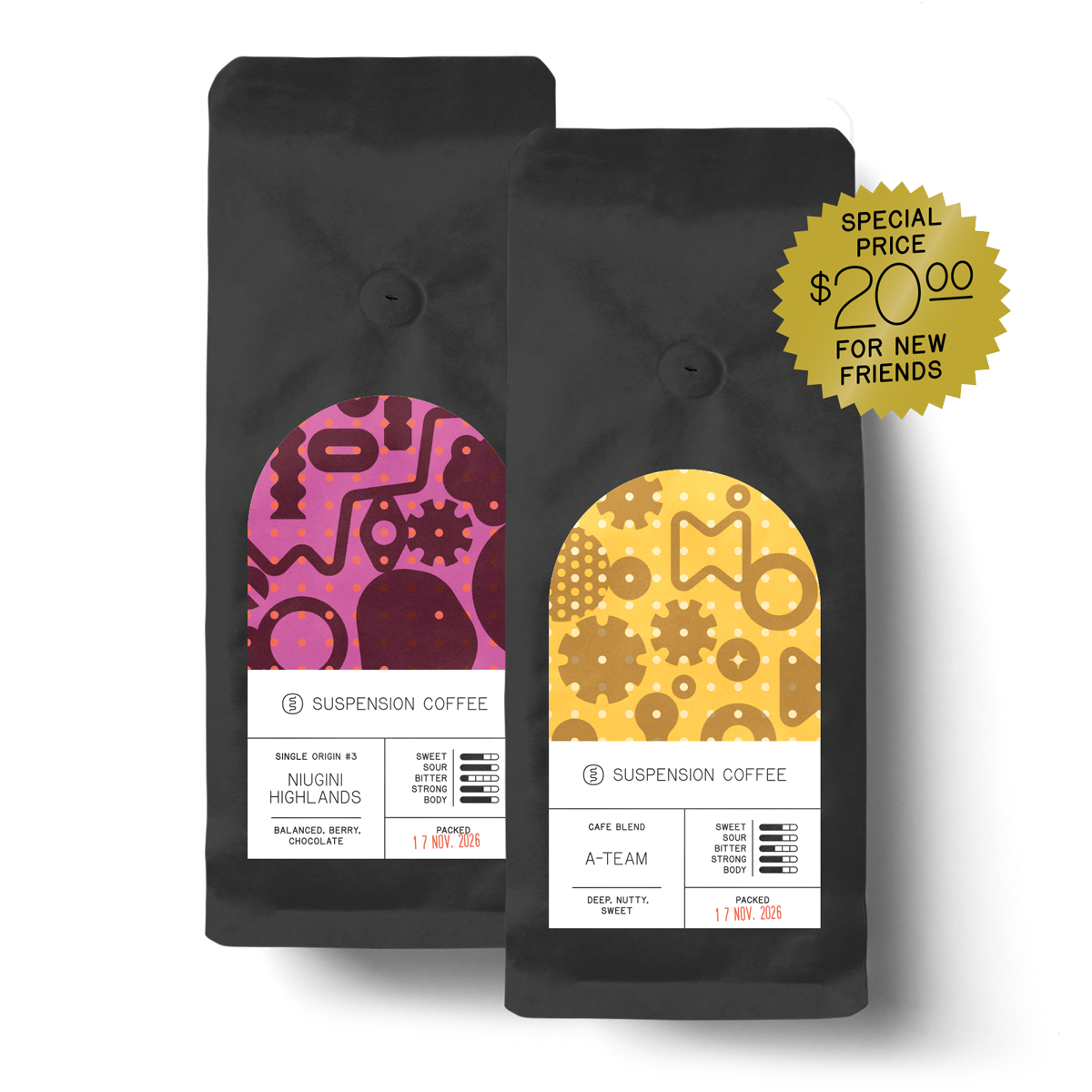 Two 250g bags of beans. One blend, one single origin. Just specify your grind, and we'll take care of the rest (The exact combination of beans you receive may not be the one you see pictured here). Leave us a note at checkout if you have flavour preferences or specific coffees you'd like to try!
